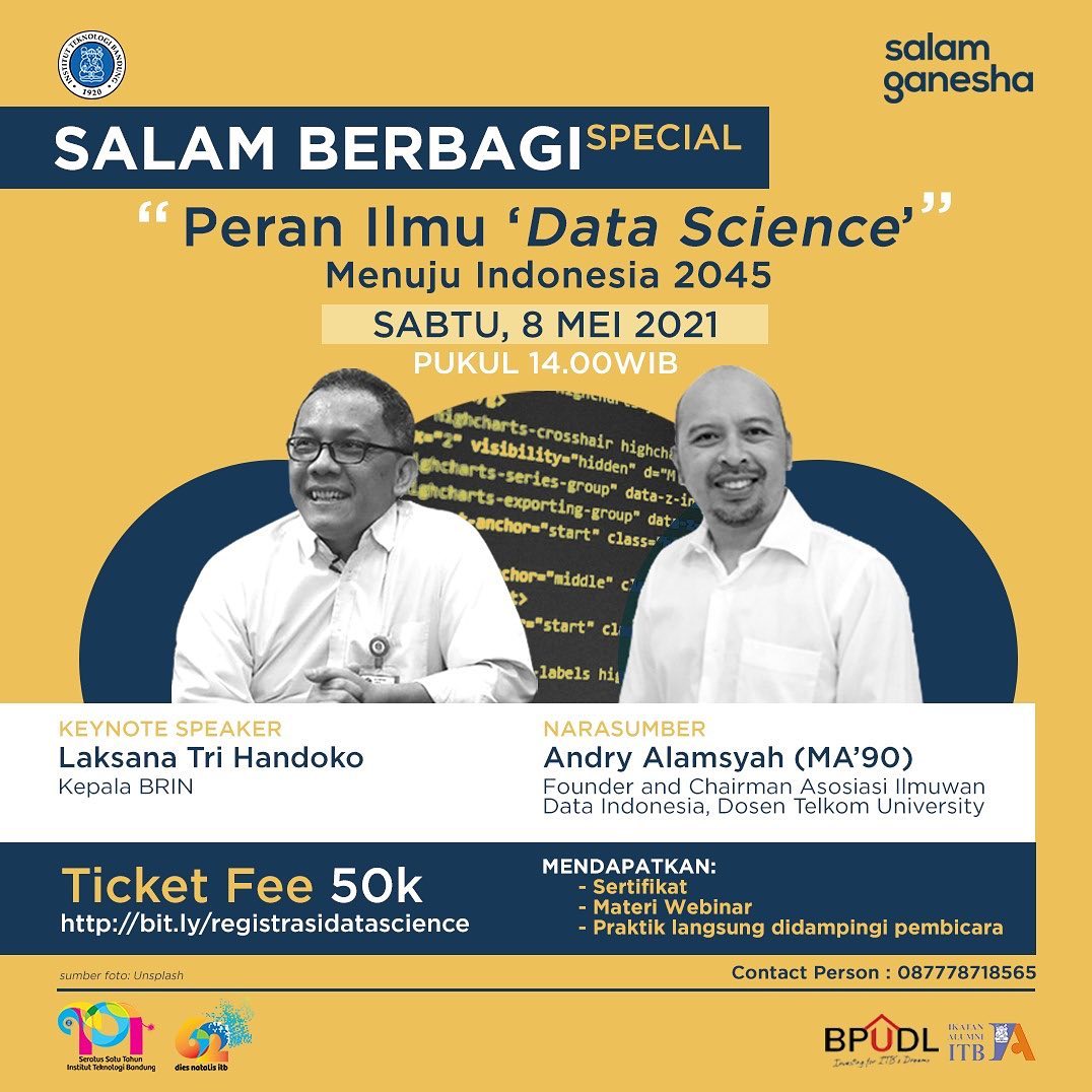 Kali ini Salam Berbagi akan membahas mengenai “Peran Ilmu Data Science menuju Indonesia 2045” bersama para narasumber-narasumber hebat.