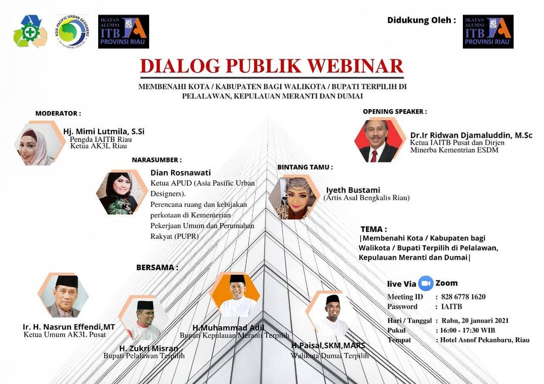 Untuk itu Pengda IAITB Riau mengharapkan partisipasi rekan2 sesama alumni menyumbangkan pemikirannya dengan ikut hadir pada “DIALOG PUBLIK WEBINAR IAITB RIAU” dengan tema Membenahi kabupaten/kota Pelalawan,Kep.Meranti,Dumai bersama Bupati/Walikota terpilih” (kehadiran sdh terkonfirmasi)
