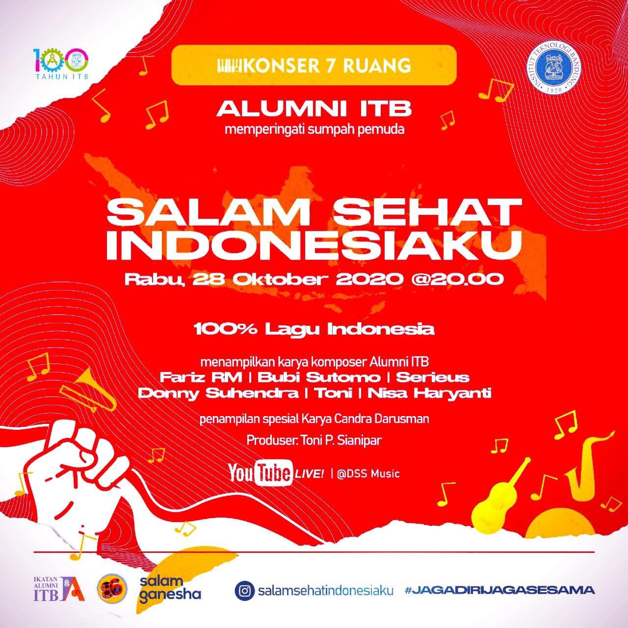 Alumni ITB dalam memperingati Sumpah Pemuda, akan menyelenggarakan Konser Musik Virtual ” SALAM SEHAT INDONESIAKU” @ Konser 7 Ruang, pada hari Rabu, tanggal 28 Oktober 2020, pkl 20.00 sd Selesai.