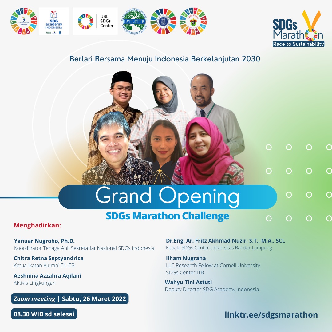 Opening Ceremony SDGs Marathon yang mengusung tema: “Berlari Bersama Menuju Indonesia Berkelanjutan 2030” akan menghadirkan narasumber-narasumber dari kalangan akademisi, praktisi, hingga aktivis untuk berdialog bersama guna membahas praktik baik Sustainable Development Goals.