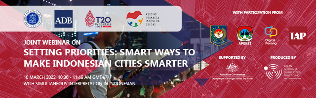 Organized by the Institute Teknologi Bandung (ITB) the Asian Development Bank (ADB) and Asosiasi Prakarsa Indonesia Cerdas (APIC), with participation from the Ministry of Home Affairs (MoHA), Indonesian Association of Cities (APEKSI), Indonesia Association of Planners (IPA) and Digital Penang, with the support of the Australian Department for Foreign Affairs and Trade (DFAT), and production support from the ASEAN Australia Smart Cities Trust Fund.