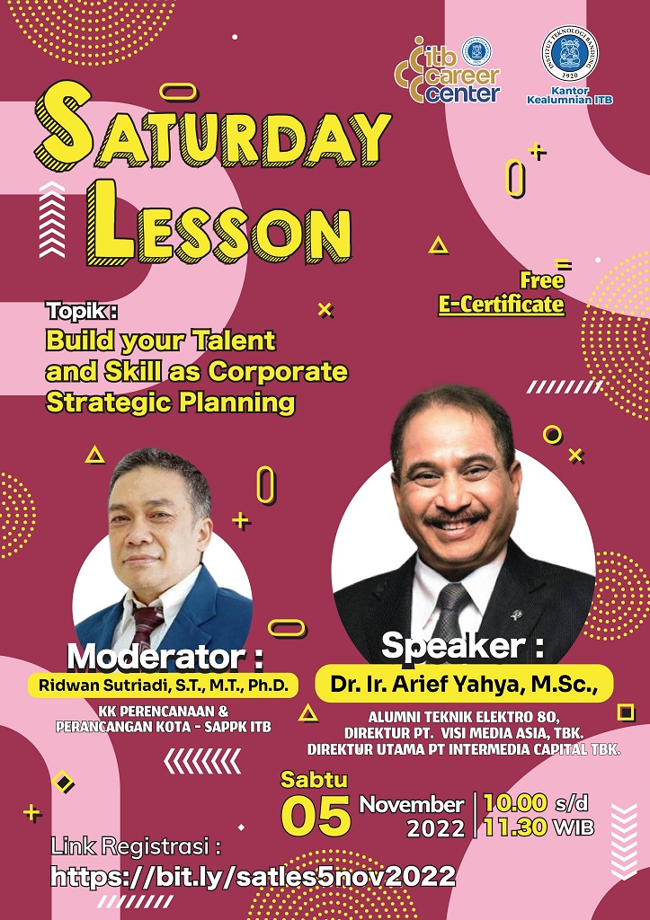 Saturday lesson kali ini bekerja sama dengan kantor kealumnian ITB yang berhasil menghadirkan Dr.Ir. Arief Yahya, M.Sc., Alumni Teknik Elektro 80, sekaligus Managing Director PT. Visi Media Asia, Tbk. Beliau juga menjabat di PT Intermedia Capital Tbk sebagai Direktur Utama. Mau tahu gimana cara membangun talenta dan kemampuan sebagai Corporate Strategic Planning? Yuk ikuti acaranya pada: