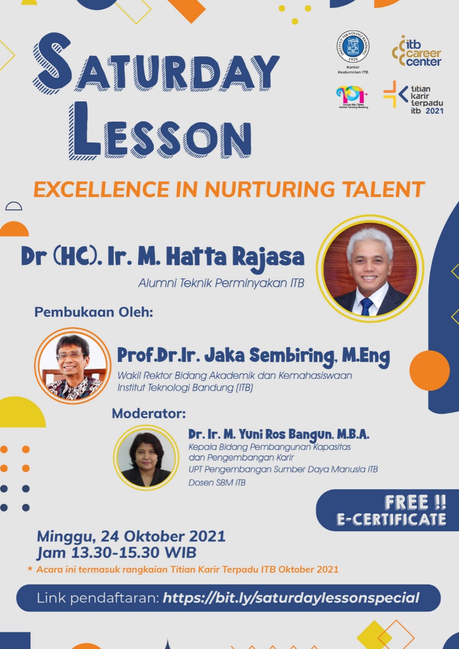 Saturday Lesson kali ini special karena menjadi bagian dari Rangkaian Acara Wisuda Oktober 2021, dengan pembicara Bapak Dr. (HC) Ir. M. Hatta Rajasa. Beliau adalah alumni Teknik Perminyakan ITB. Acara ini akan dibuka oleh Prof. Dr. Ir. Jaka Sembiring, M.Eng selaku Wakil Rektor Bidang Akademik dan Kemahasiswaan ITB, dan dimoderatori oleh Ibu Dr. Ir. M. Yuni Ros Bangun, MBA. selaku Kepala Bidang Pembangunan Kapasitas dan Pengembangan Karir, UPT Pengembangan Sumber Daya Manusia ITB.