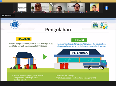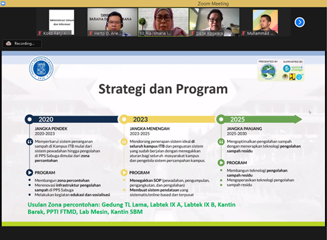 In the short-term program, the waste management system will be renewed, starting from containerization to processing at PPS Sabuga by building a pilot zone to conducting education and outreach. In the mid-term program, the ideal system will be implemented throughout the ITB campus, and the long-term program will optimize waste processing by applying residual waste processing technology.