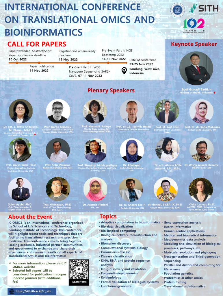 School of Life Sciences and Technology, Bandung Institute of Technology is pleased to host an international conference with the theme “Translational Omics and Bioinformatics” on November 23-25, 2022. The programme will discuss how informatics can be used to improve research and development in Vaccine, Therapeutics, and Diagnostics, and how it is helping to centralise and organise medical knowledge.