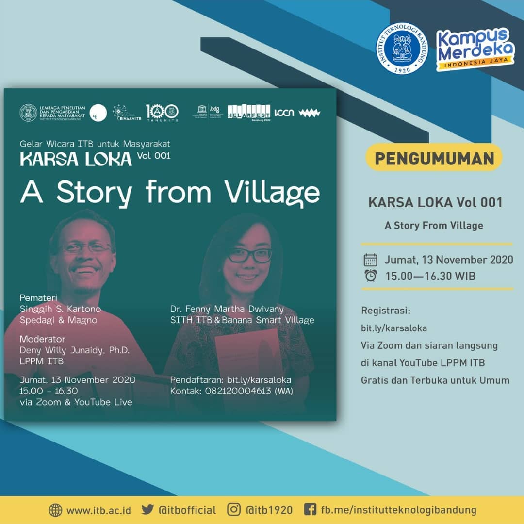 LPPM ITB bekerjasama dengan Design Ethnography Lab. FSRD ITB @itbdesignethno mengelola gelar wicara bertajuk Karsa Loka dengan menghadirkan aktivis desa, social entrepreneur, pemberdaya desa (local enabler) dari berbagai bidang. Para tokoh akan berbagi ilmu serta best practice dalam Pemberdayaan Masyarakat melalui inovasi sains, seni dan teknologi tepat guna.