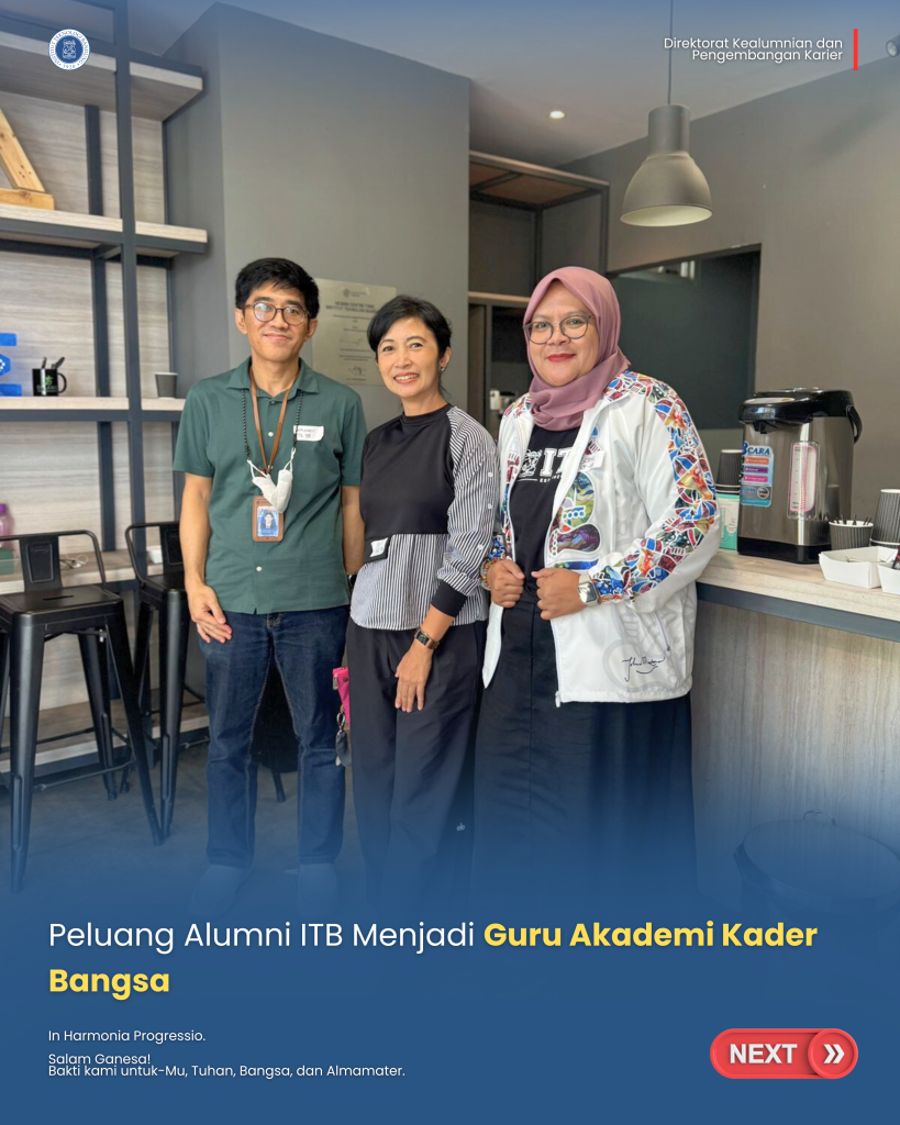 Salah satu peluang yang dibahas adalah kesempatan bagi alumni ITB, minimal lulusan tingkat sarjana, untuk bergabung sebagai Guru di Akademi Kader Bangsa — sebuah akademi yang berfokus pada pembentukan karakter dan kapasitas kepemimpinan generasi muda Indonesia.