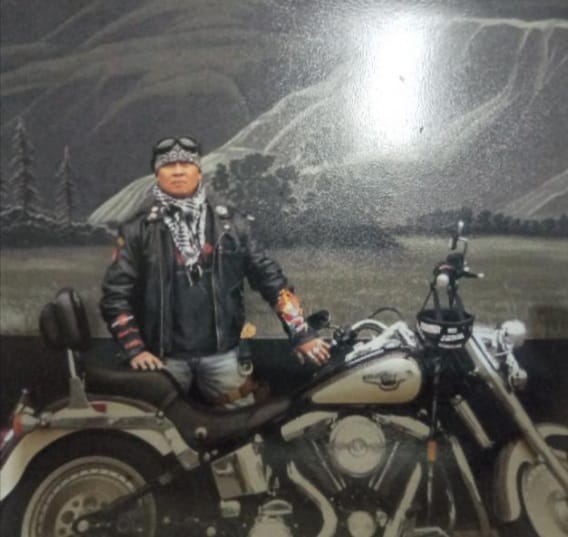 Almarhum Bibib dengan El Guapo, motor kesayangannya didepan Mural karya almarhum.