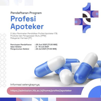 Pendaftaran Program Profesi Apoteker 2 Jalur Peminatan Pendidikan Profesi Apoteker ITB; Produksi dan Pengawasan Mutu (PPM) Pelayanan Farmasi (PF) Penutupan Pendaftaran : 29 Juni 2021 (17.00 WIB) Ujian Seleksi :... Read More