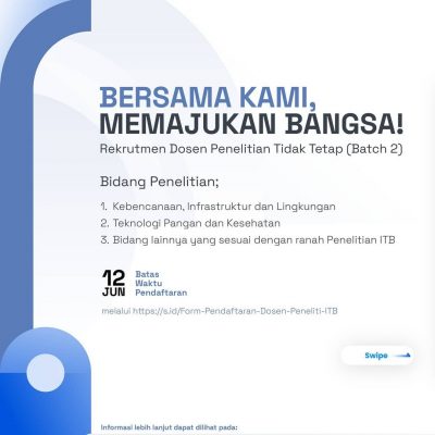 [PENGUMUMAN] Bersama Kami, Memajukan Bangsa! Rekrutmen Dosen Tidak Tetap Peneliti (Batch 2) Bidang penelitian: 1. Kebencanaan, Infrastruktur, dan Lingkungan 2. Teknologi Pangan dan Kesehatan 3. Bidang lainnya yang sesuai dengan... Read More