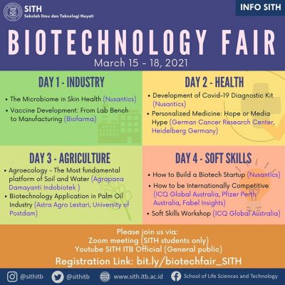 Prodi Magister Bioteknologi SITH ITB mempersembahkan BIOTECHNOLOGY FAIR Acara ini terdiri atas webinar series dengan 4 tema utama yaitu: Day 1: Industry (@nusantics & @biofarmaid ) Day 2: Health (Nusantics &... Read More