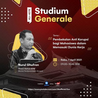 Studium Generale KU-4078 Pembicara : Nurul Ghufron (Wakil Ketua KPK (Komisi Pemberantasan Korupsi)) “Pembekalan Anti Korupsi bagi Mahasiswa dalam Memasuki Dunia Kerja” Hari, tanggal : Rabu, 7 April 2021... Read More